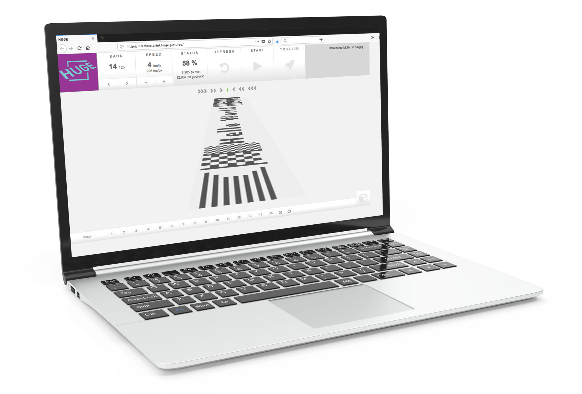 Der HUGE Bodendrucker ist in vielen Bereichen flexibel einsetzbar, um zum Beispiel Außenwerbung, Leitsysteme und Bodenmarkierungen auf fast alle Untergründe aufzubringen. HUGE ist der schnellste georeferenzierte Bodendrucker der Welt.